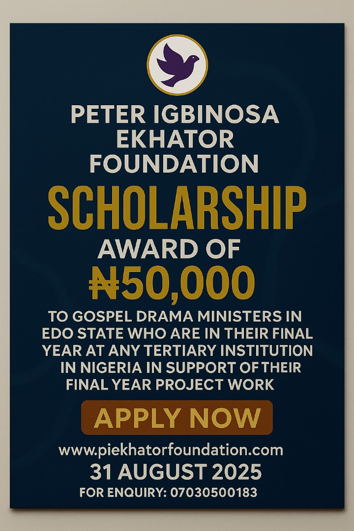 The Deacon Peter Igbinosa Scholarship Award is established to support committed Christian drama ministers who are in their final year of undergraduate studies in Nigerian universities. This scholarship seeks to ease the financial burden of their final-year project and related academic responsibilities, thereby empowering them to remain active in their divine calling while completing their academic pursuits.