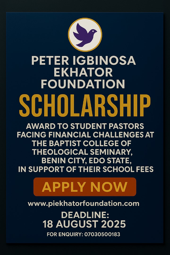 The Deacon Peter Igbinosa Scholarship Award is aimed at supporting final-year pastors-in-training at the College of Theological Seminary, Benin City, who are genuinely committed to the call of God but are struggling with the burden of completing their school fees. This scholarship seeks to provide partial or full financial relief to such candidates to help them complete their theological training and enter into ministry effectively.